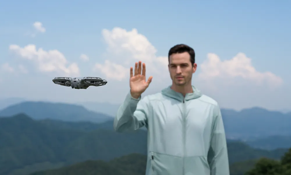 Justera enkelt Neo 2:s riktning och avstånd med en eller båda händerna. Rikta handflatan mot drönaren för att styra den uppåt, nedåt, eller åt sidan, eller använd båda handflatorna för exakt kontroll över avståndet. Ingen fjärrkontroll behövs för att justera kameravinkeln.